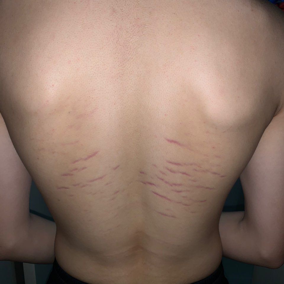 질문하신 내용에 대하여 아래와 같이 답변 드립니다.사진은 튼 살이 생긴 것이랍니다. 왜 생기는지는 명확하지는 않지만 사춘기에 급격하게 체격이 커지면서 생기는 경우가 많답니다. (성장통은 아니지만 성장하면서 생기는 것은 맞아요.) 튼살 자체는 건강에 문제가 있는 것은 아니랍니다. 다만 보기가 조금 좋아보이지 않아서 레이져 치료 같은 걸로 조절해 보기도 하지요.