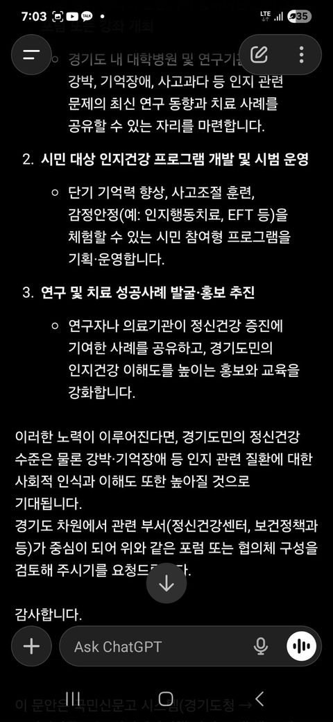 1. 이런 인지·정신건강 관련 프로그램이나 연구사업을 경기도에 제안하면 실제로 검토되거나 시행될 가능성이 있을까요?