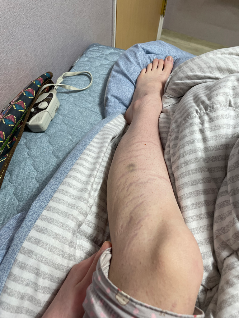 그 후로 지하철에 에스컬레이터로 내려갈 때와 잠깐 걸을때는 근육통이 남은 것 처럼 아프더, 집에 도착했을때에 통증은 줄었지만 멍이 3군데? 정도 들어서 걱정이 크네요.