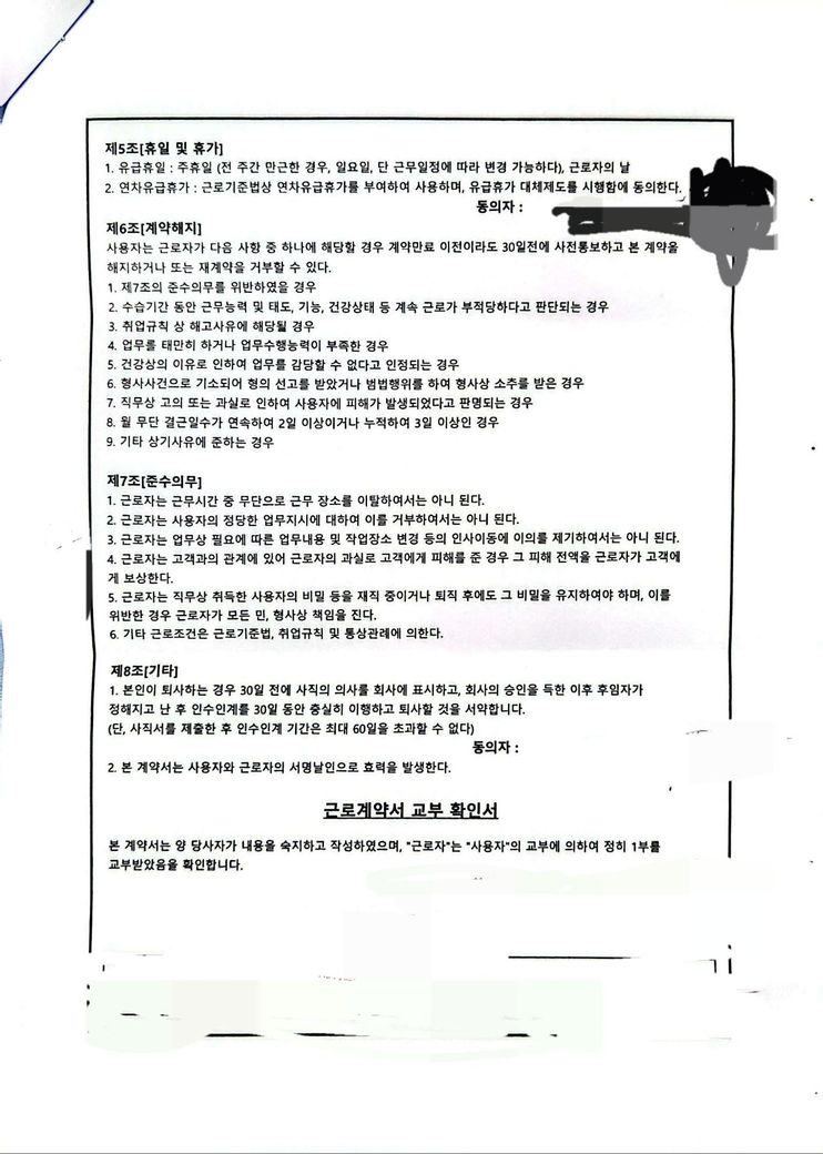상기 계약에 따라 30일 전에 사직의 의사표시를 하지 않고 무단 퇴사할 때는 이에 따른 손해배상 책임을 지게되나, 실제 사용자가 손해액을 입증하기란 현실적으로 어려우므로 무단 퇴사하더라도 법적 책임을 지기 어렵다는 점 참고하시기 바랍니다.