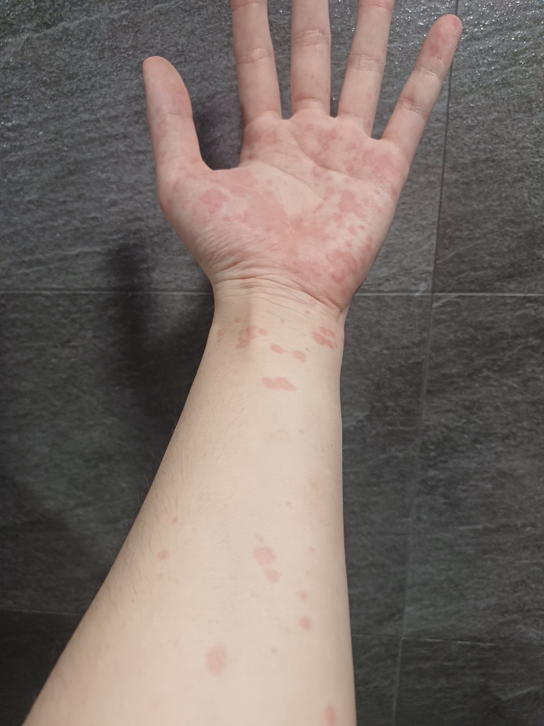 피부과에서 들으신대로 두드리기 같습니다. 손 주변으로 뭔가 자극이 되면 알레르기 반응이 나타나는 것이지요. 약을 먹는 것도 중요하지만 자극을 피하는 것도 필요합니다. 자극이 되는 원인은 찾아봐야되겠구요.