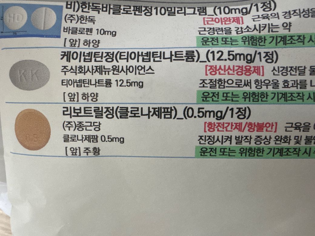리보트릴정은 마지막으로 어제 저녁에 먹었고 나머지 바클로펜정과 케이넵틴정은 오늘 아침에