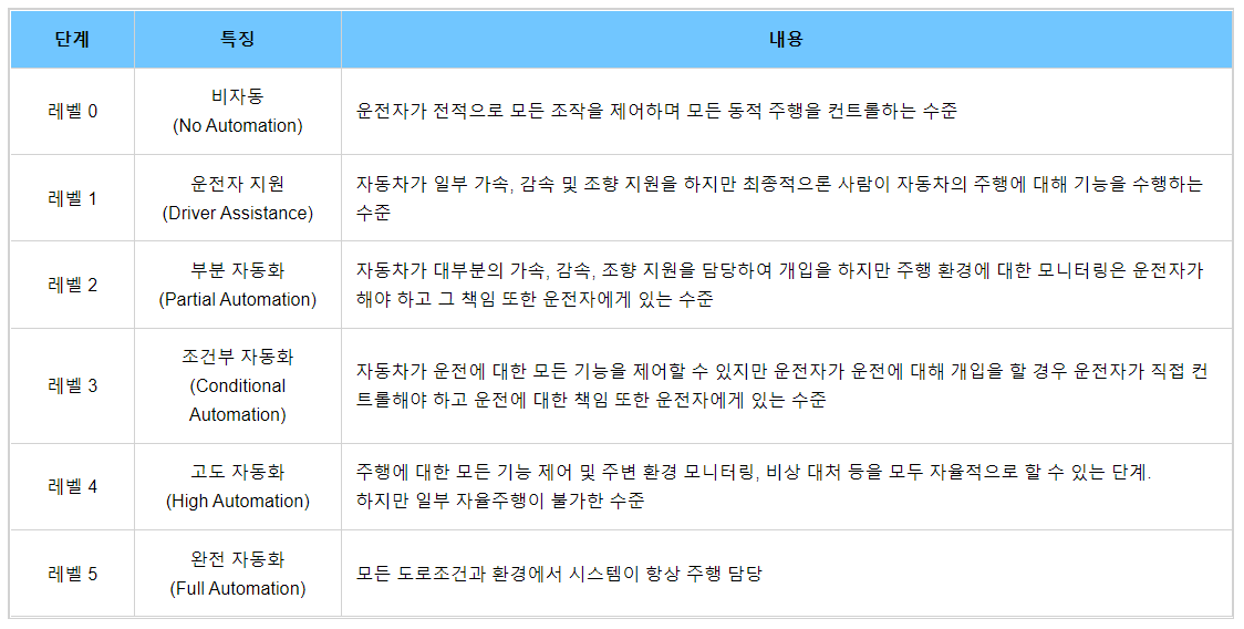 5단계가 완전 자율 주행이며 운전자가 완전히 불필요한 상태, 즉, 시스템이 모두 처리하는 단계입니다.