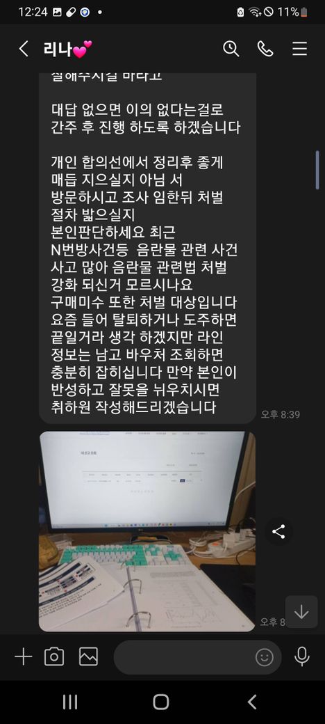 SNS에서 음란물을 판매하는 여성에게 하면 안되는걸 알지만 호기심이 생겨서 인사만 했을 뿐인데 갑자기 n번방 박사방 같은 범죄에 대한 항목이 강화 되었다는걸 강조하며 구매 미수 또한 처벌의 대상이 된다고 말하네요. 그리고 돈을 입금하라고 협박을 하고 있네요. 이 문제와 관련된 다른 분의 질문을 보니 첨부된 파일에 있는 말까지 똑같은게 수상합니다.