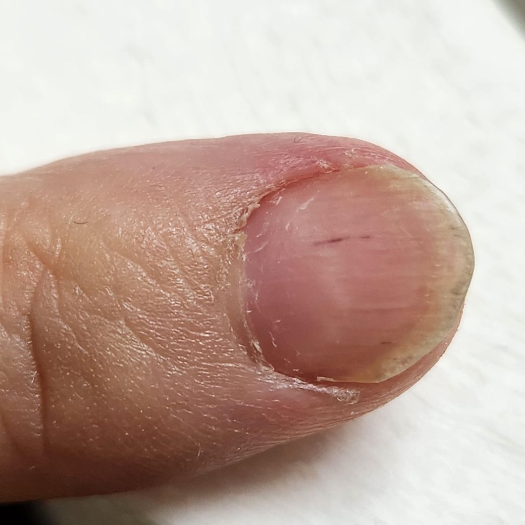 손톱중간에 저 검은 색 선? 은 얼마전에 생겼어요 피부과는 아직 안가봤어요 무좀일까요? 치료받아야하는가요?