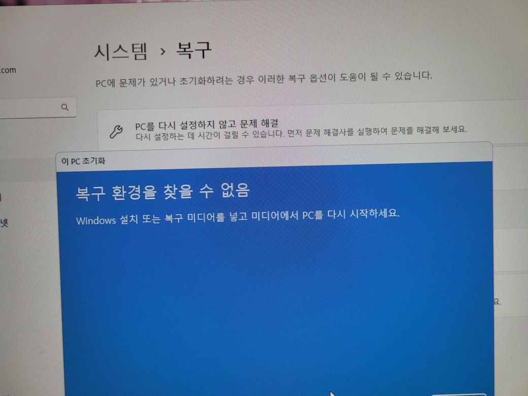 PC초기화를 눌러서 모든항목 제거를 누르면 저런 글이 뜨면서 포맷이 안됍니다 도대체 저걸 어떻게 해결하고 복구 미디어는 또 뭔가요?..