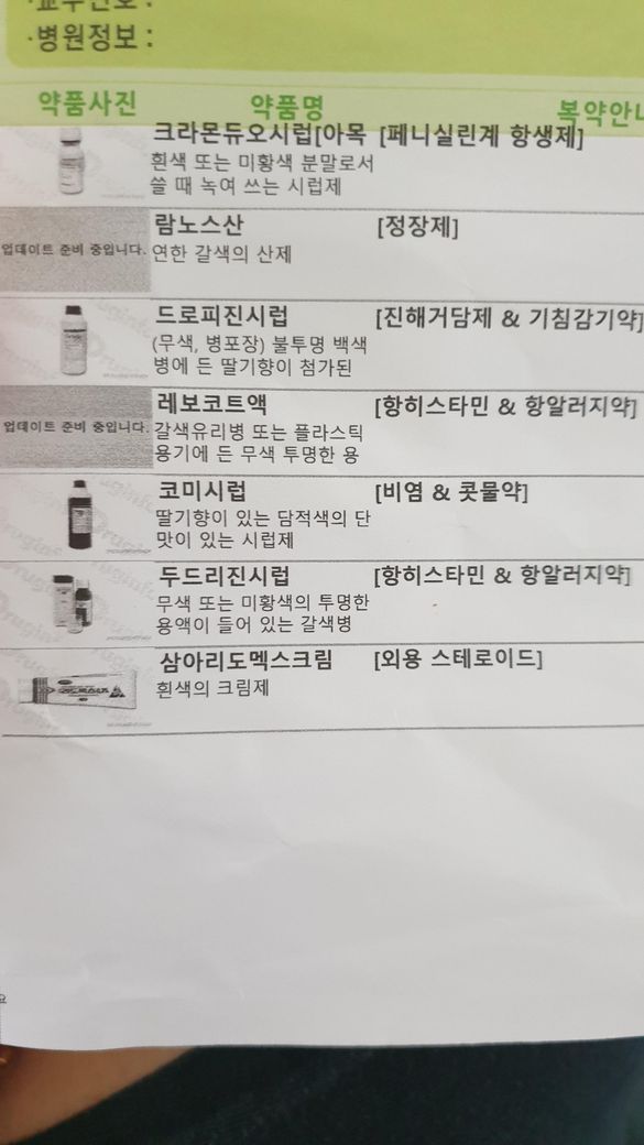 코미시럽, 두드리진시럽 둘다 항히스타민제이고 코미시럽은 콧물, 코막힘, 두드리진시럽은 피부 알러지증상에 주로 씁니다.