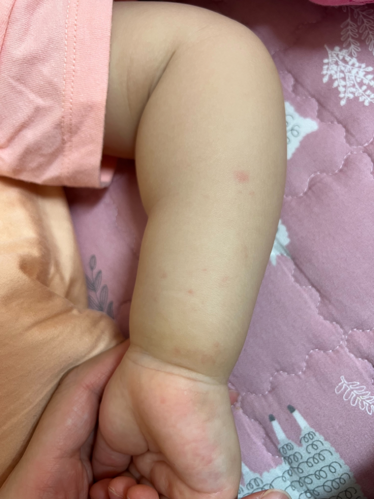 좀 애매하기는 한데 손바닥에도 수포가 몇개 보이는 것 같아요. 아이가 잘 안 먹으려고 하고 침을 질질 흘린다면 입 안에도 수포가 생겼을 겁니다. 수족구가 요즘 유행이라서 가능성은 충분히 있으니 소아과에서 재차 확인을 해 보시기 바랍니다.