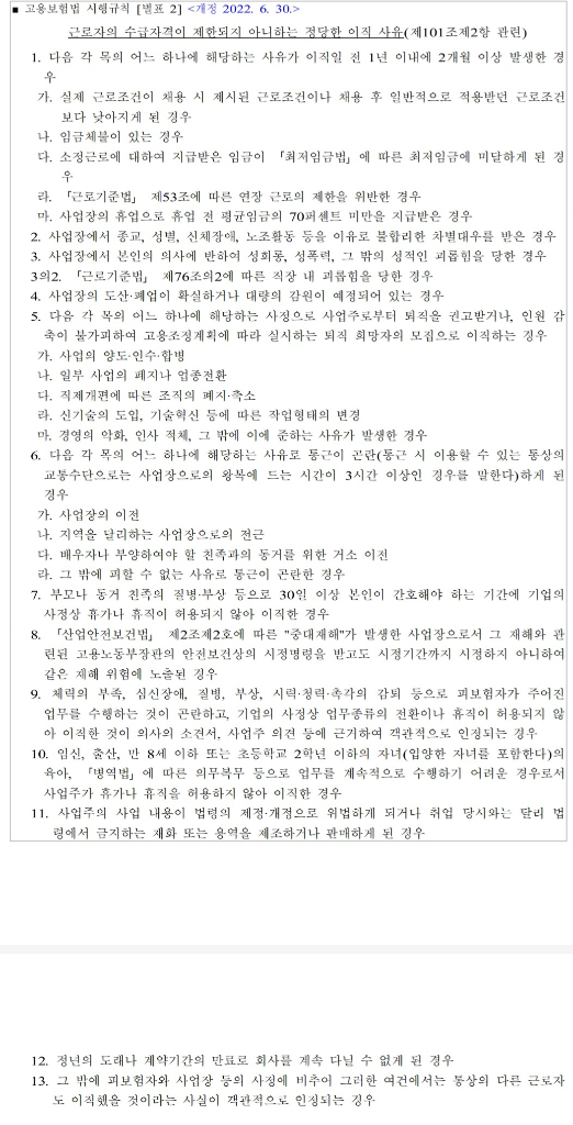 고용보험법 시행규칙 제101조 제2항 별표2에 따른 사유에 해당하지 않는 한