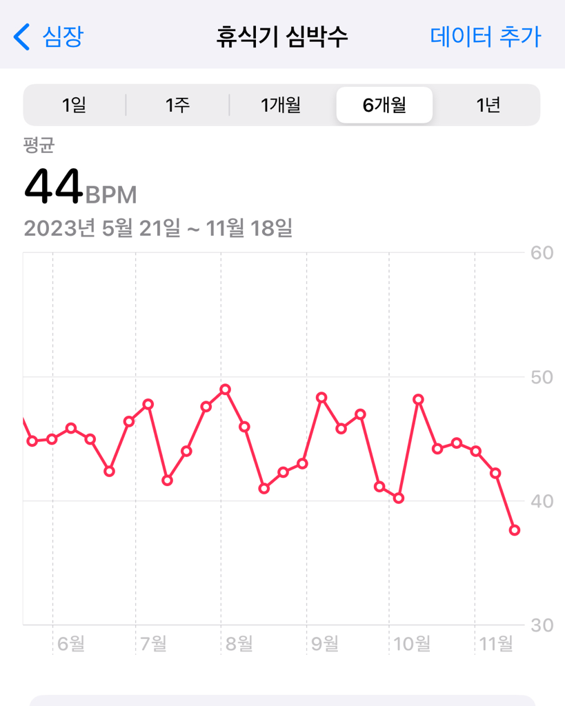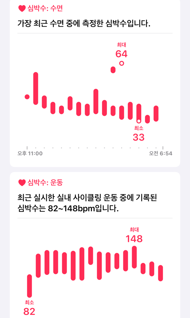요즘 휴식기 심박수는 42정도 걸을때 72 운동할때 125-150 수면시31-33(최하)이렇게 나옵니다
