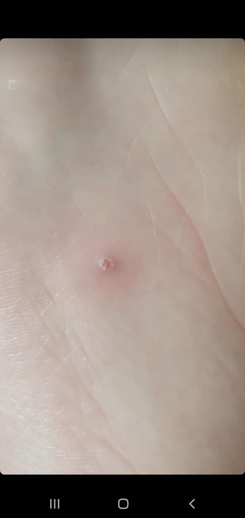 사진으로 정확하게 파악할 순 없지만 발바닥에 지름 0.1cm 정도의 물집처럼 보이는 굳은살이 생겼다면, 마찰이나 압박으로 인한 일시적인 물집일 가능성이 큽니다. 통증이 없다면 당장 치료할 필요는 없지만, 크기가 커지거나 안쪽으로 파이는 느낌이 들면 티눈이나 사마귀일 수도 있으므로 경과를 잘 지켜봐야 합니다.