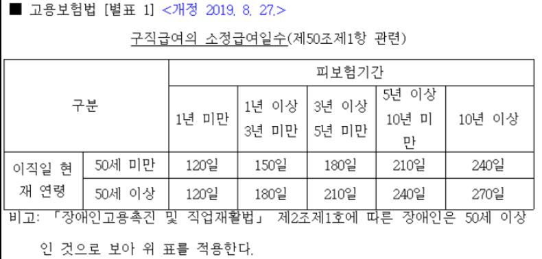 2. 이직 당시의 연령 및 피보험기간에 따라 다음과 같이 소정급여일수에 따라 구직급여를 수급할 수 있습니다.