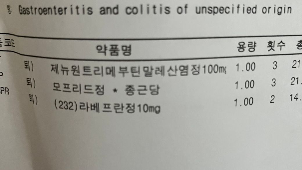 22일부터 제뉴원 트리메부틴말레산염정 100mg, 모프리드정, 라베프란정 10mg을 복용 중인데요 약 부작용으로 졸음이 있을수도 있다고 적혀있어서 감안하고 복용 중이었는데 금요일(26일)에 가스도 차고 복통, 대변3번 무른변 1번을 보더라구요 저녁에는 일시적이지만 어지럽기도 엄청 어지러웠고요 토요일엔 괜찮았고 일요일인 어젠 대변 1번 설사 2번 했어요 약물 부작용에 대해 찾아보니(트리메부틴말레산염정에 대해서만 찾아봤습니다) 설사, 어지럼증, 복부팽만감 이런게 나오던데 병원 측에선 약 때문에 그럴 리가 없대요.. 계속 그러면 외래진료 오라고 하시더라구요 정말 약 때문이 아닌건가 싶어져서 질문 남겨봅니다