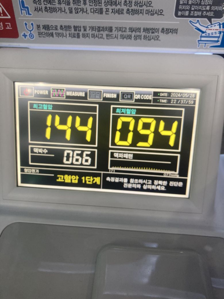 고혈압의 기준은 일반적으로 다음과 같이 나뉩니다: 수축기 혈압(상압) 140 mmHg 이상 또는 이완기 혈압(하압) 90 mmHg 이상일 때 고혈압으로 진단됩니다. 사진에 나타난 혈압 수치는 144/94로, 고혈압 1단계에 해당합니다. 그러나 이후 병원에서 측정한 120/78은 정상 범위에 속합니다. 이는 혈압이 상황에 따라 변동할 수 있음을 나타내며, 일시적인 스트레스, 신체 활동, 또는 다른 요인들에 의해 일시적으로 높아질 수 있습니다.