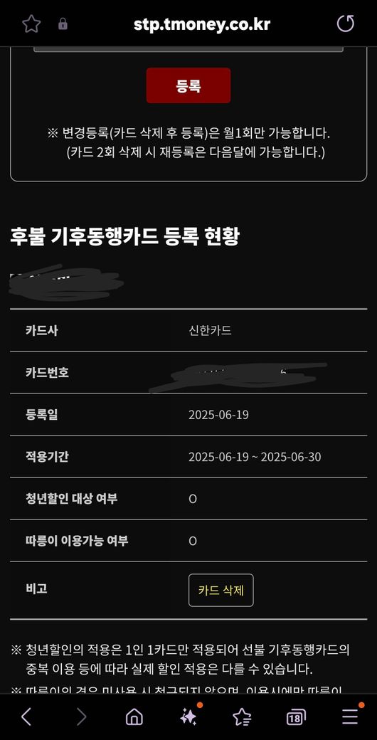 어제 신한카드로 신한체크후불 기후동행카드를 받아서 티머니 홈페이지에 등록하고 썻는데 후불기후동행카드 사전등록이라고 카드기에 계속뜨는데 적용이 안되는건가요?