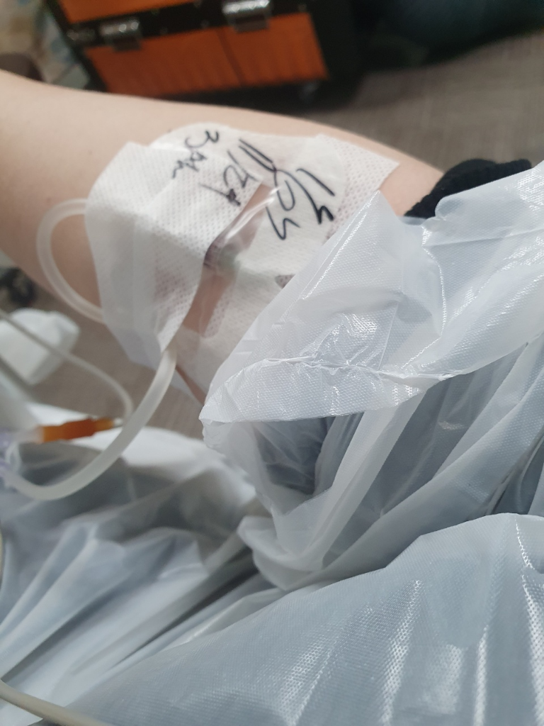 정확한 상태를 알기는 어렵네요. 다만 입원중이라면 환자복을 입고 있을 텐데 흰색 비닐 가운만 입고 있어서 조금 이상하기는 합니다. 주사 맞는 곳은 글자가 잘 안보여요.