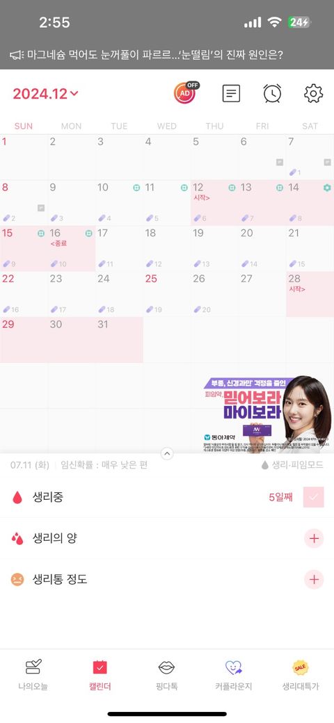 12일도 안돼서 또 생리 5일 (경구피임약을 끊었기 때문에)