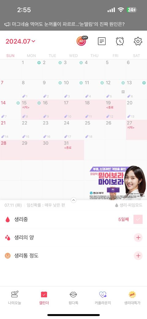 생리를 늦추는것에 실패하여 7/15~19일간 총 5일 생리 하였음.