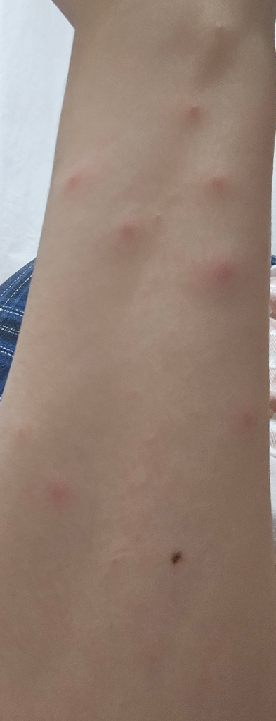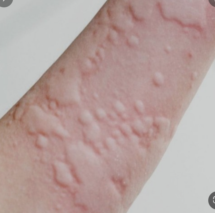 두드러기는 알러지의 일종으로 물방울을 책상에 떨어트리면 물방울이 모으는 형태로 피부에 융기가 생기는 병변을 이야기합니다. 아래 사진에서 보이는것과 같습니다.