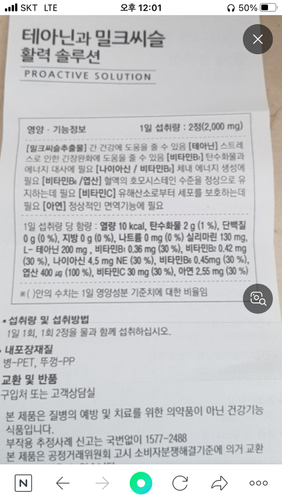 성분이 조금 중복되는 것들이 있지만, 테아닌과 밀크씨슬 제품에 들어있는 비타민B군의 성분함량은 낮은 편이기 때문에