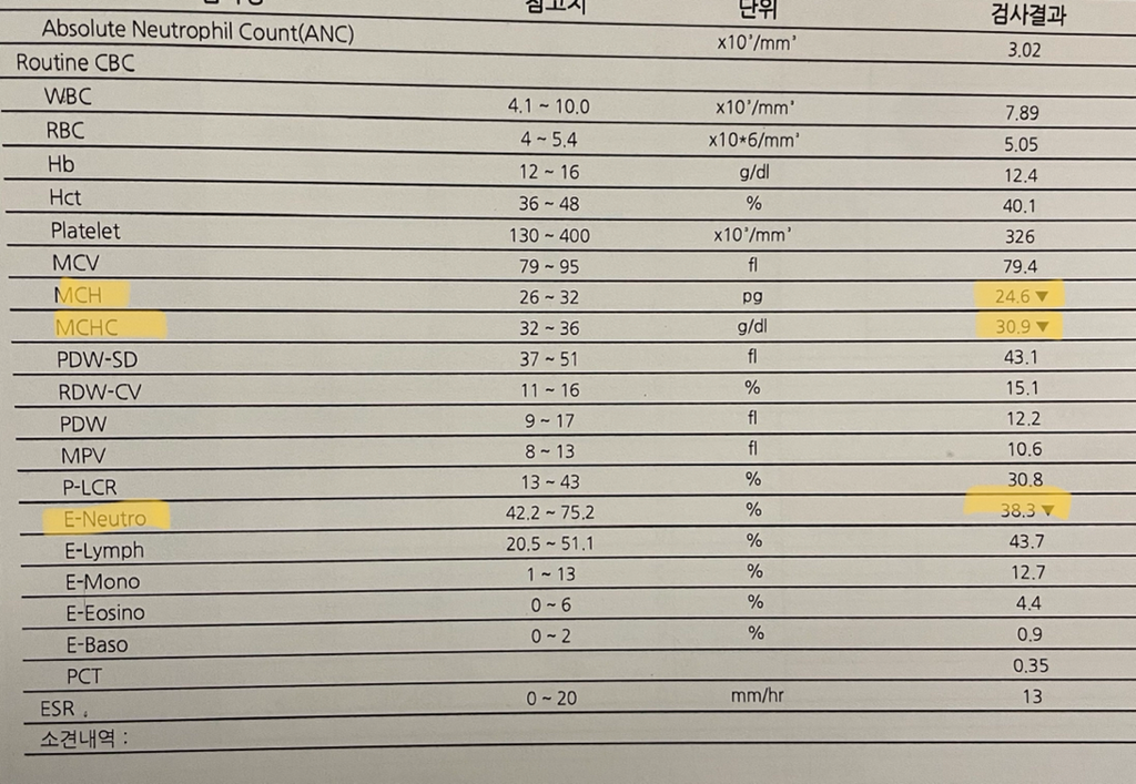 MCHC나 MCH는 적혈구와 관련이 있으며 빈혈이 있을 경우 빈혈의 원인을 감별하는데 유용하며 단독으로는 큰 의미는 없습니다. 또한 neutro는 백혈구 분획으로 감염시 상승할 수 있으나 역시 임상 상황과 연관이 필요합니다.
