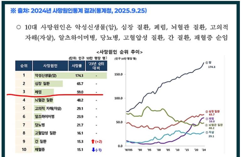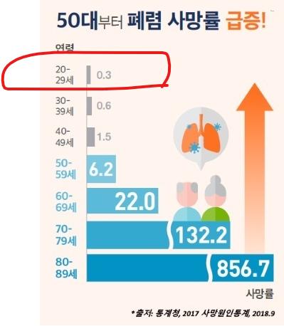 전체 사망원인 중에서 폐렴이 주요 원인을 차지하기는 하지만 이는 고령에서의 이야기이며 젊은 연령에서는