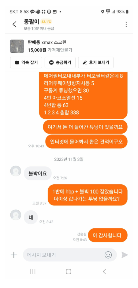 판매자는 이전판매자에게 튜닝비 400에 설명듣고 더 비싸게 팔겠다고