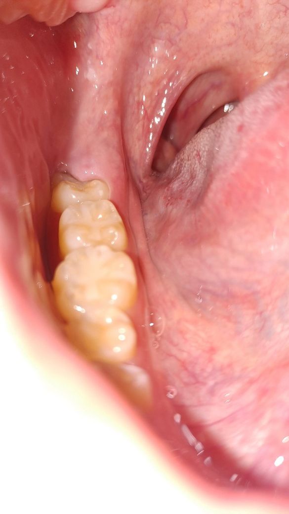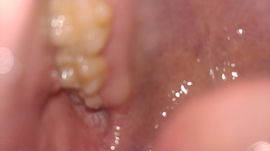 치관주위염이 의심되는 상황입니다. 사랑니 주변의 잇몸이 사랑니를 덮어 그 사이 공간에 음식물이 끼게되고 청소가 잘되지 않아 내부에서 부패가 일어나게되면 만성적으로 염증이 반복됩니다.