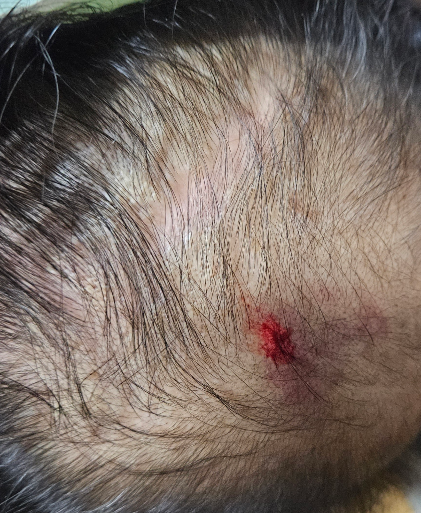 1cm가량 찢어진 상태이고 한, 두번 의료용 스테이플러로 봉합할만한 상처로 보입니다. 의료기관을 방문하시는 편이 좋겠고, 상처가 얕다면 봉합 없이 소독만 할 수도 있겠습니다. 당장 지혈은 깨끗한 수건으로 하셔도 괜찮고 이후엔 따갑겠지만 알콜솜으로 상처를 소독해보시기 바랍니다.