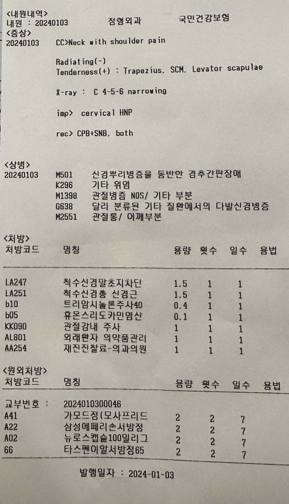 경추디스크로 인한 통증으로 진단을 받으셨네요
