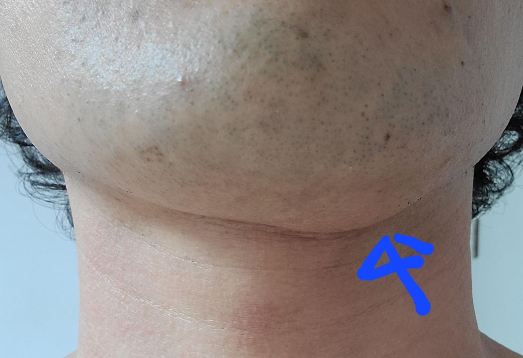 턱 아래의 오른쪽만 살짝 볼록합니다.