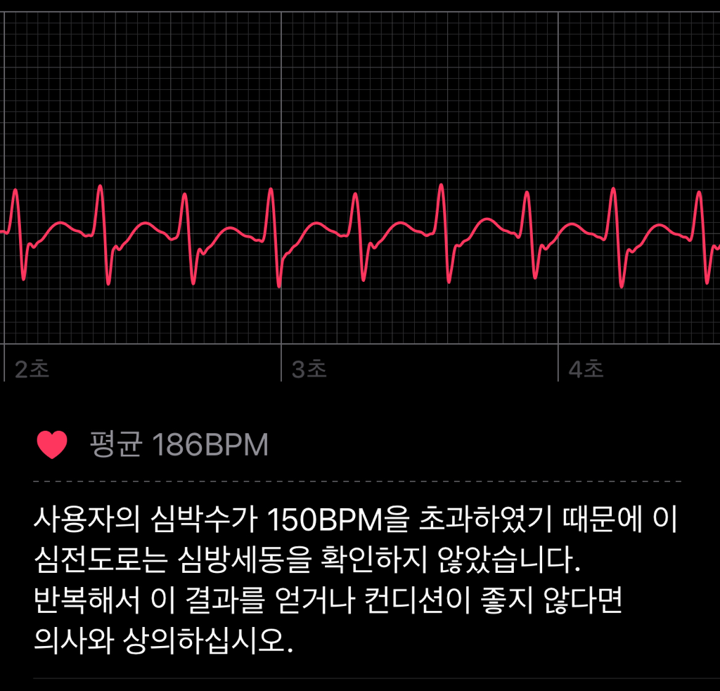지금 올려주신 심전도로는 명확히 부정맥을 확인하기는 어려운 파형입니다. 그림에서 언급된 심방세동은 심장에서 심방수축을 보이는 심전도상 P 파형이 보이지 않으면서 심장박동의 간격이 불규칙한 경우로 보고 있으나 심박수 분당 120회 정도 이상에서의 단순심전도로는 P파형이 숨겨질수 있기 때문에 명확히 심방세동을 확인하기 위해서는 정밀 심전도 검사가 필요합니다. 다만 충분한 안정시에도 상기 심박수만큼 심전도상 결과과 나왔다면 비정형적 빈맥일 가능성이 있으므로 반드시 근처 내과에서 검사 및 진료를 보실 것을 권유드립니다.