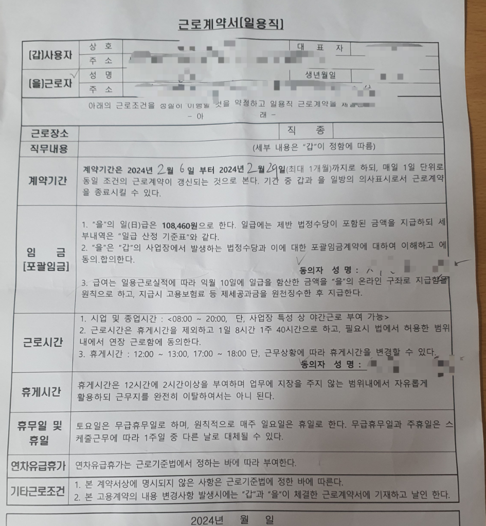 2024년 2월6일부터 2월29일까지 일용직 근로계약을 했습니다.