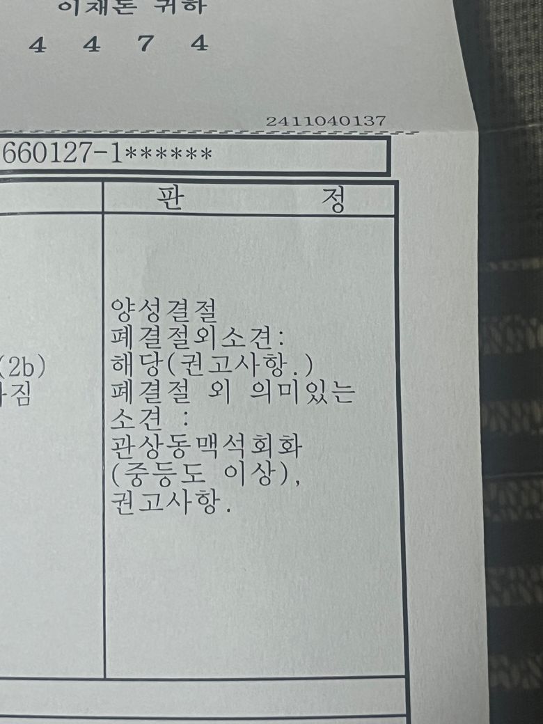 결과지를 일부만 찍어 올려주셔서 답변이 어렵습니다만 폐 결절은 양성 병변으로 생각되므로 시간을 두고 추정 검사를 받기 바랍니다.