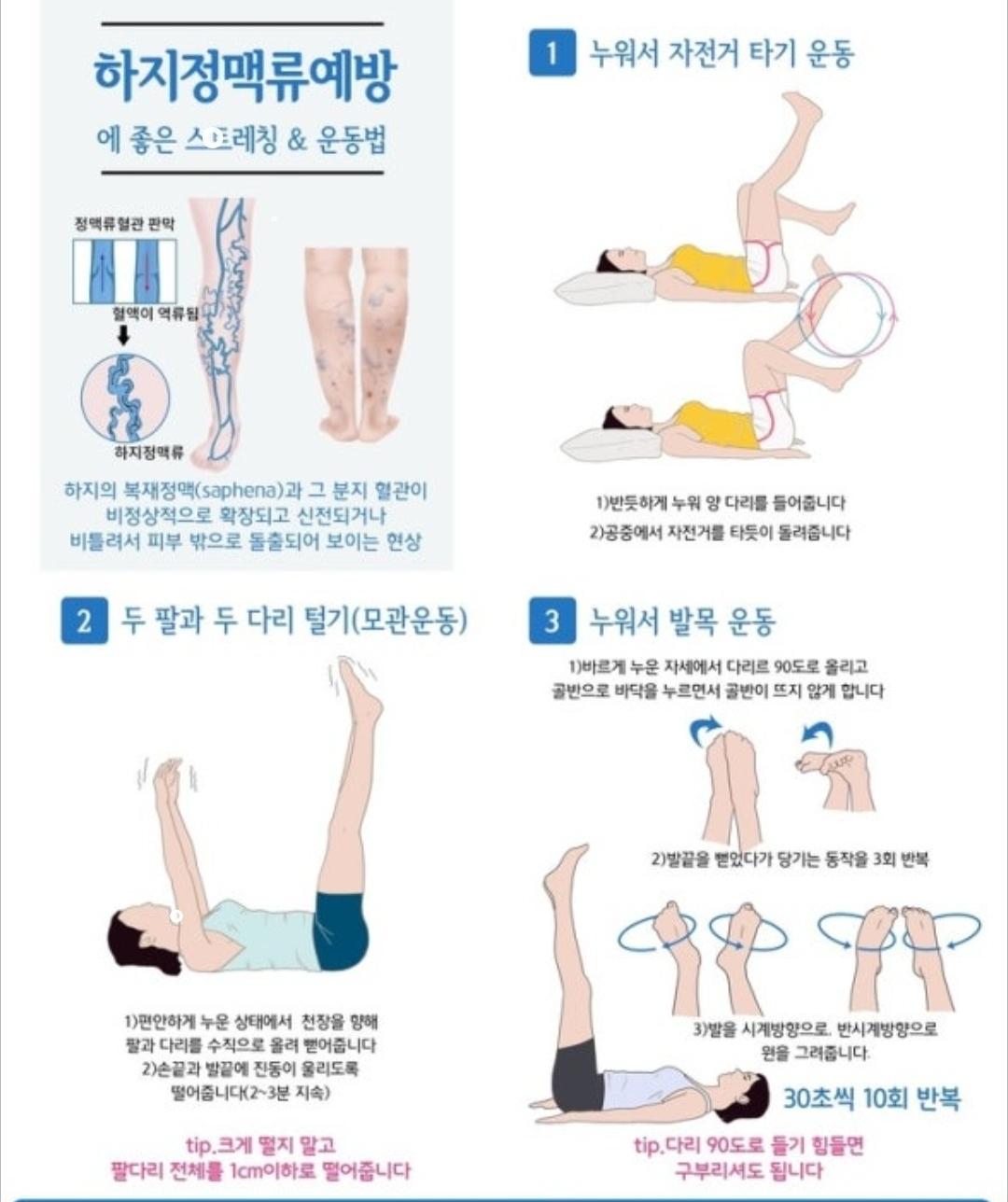 1. 종아리 근육의 수축과 이완을 위한 운동기구나 걷기나 수영 및 가벼운 강도의 실내유산소 운동이 도움이 될 수 있습니다.