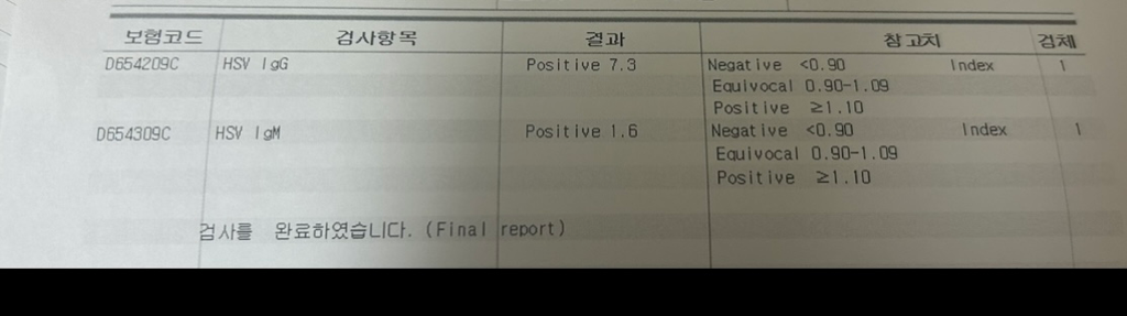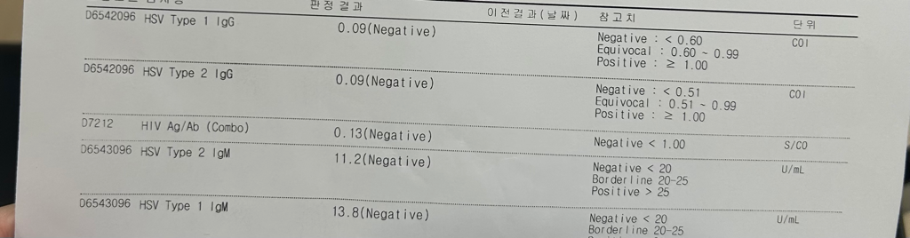 결국 음성이네요. 1차 검사에서 위양성이었나 봅니다. 1번은 1형 검사고 2차는 2형 검사입니다. 3번은 1형, 2형 모두 검사한 것이구요.