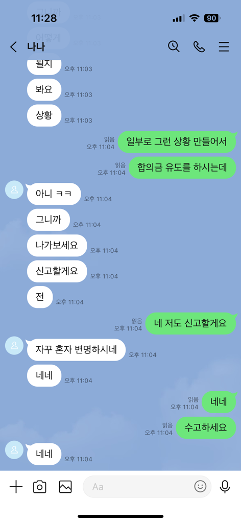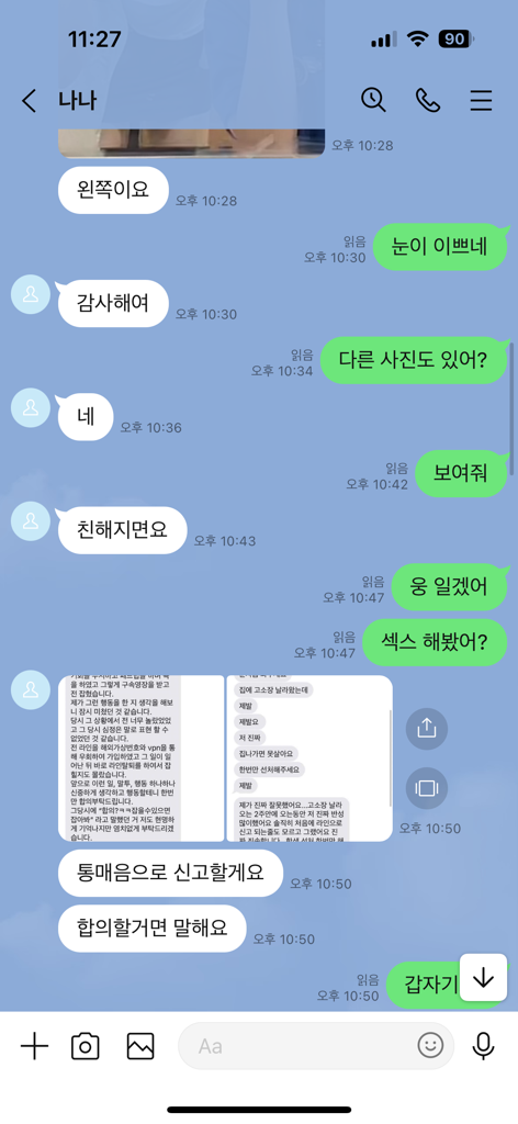 위 대화내용을 보면, 상대방은 처음에는 성적대화에 응하는 모습을 보이는바, 헌터일 가능성이 높아 보입니다. 상대방이 헌터라면 위 사실관계 그대로 고소를 하지 않을 것이기 때문에 고소를 당할 가능성이 있습니다.