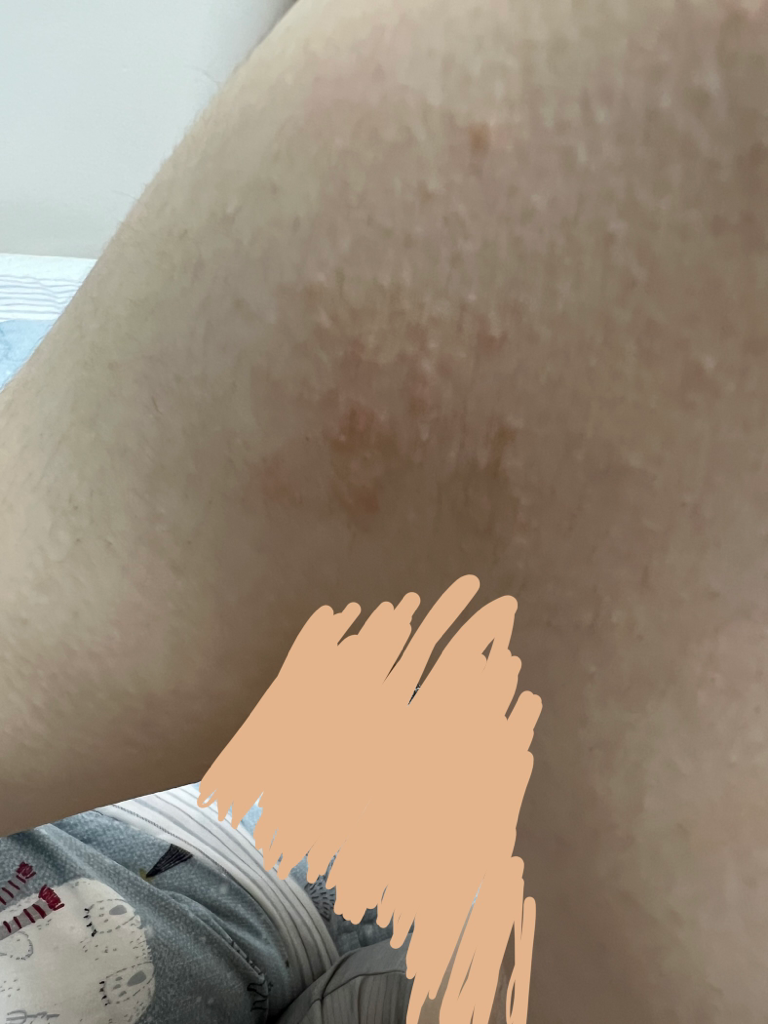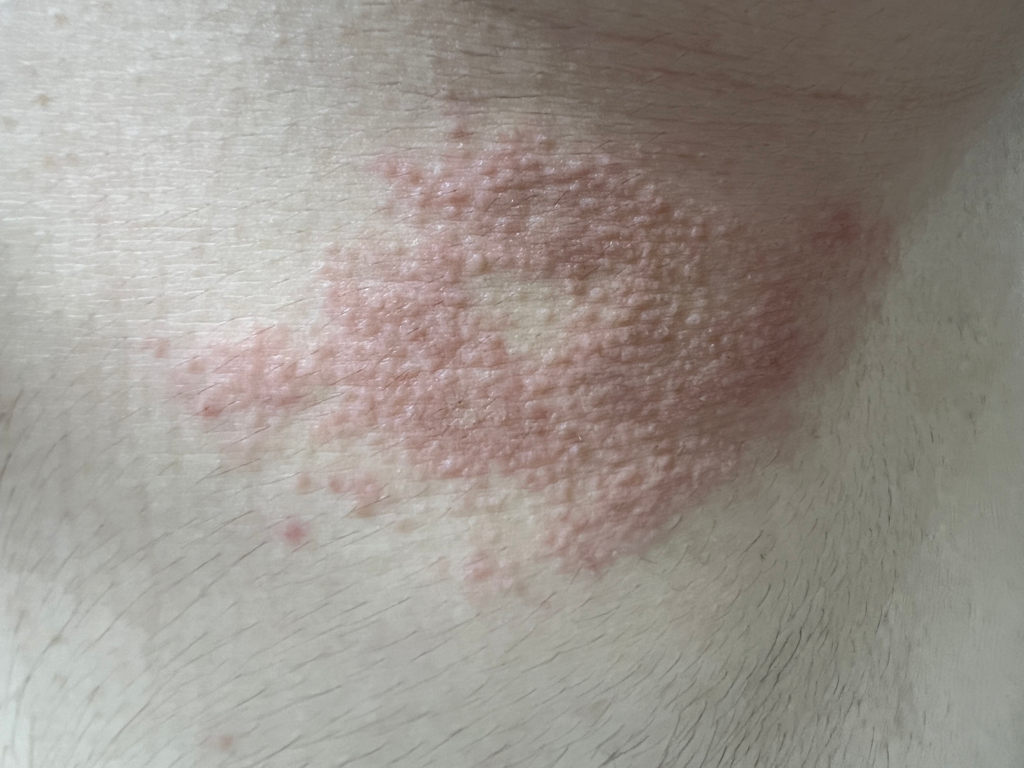 사진만으로는 정확한 진단을 내리기는 어려우나, 발생한 부위나 양상을 고려해 보았을 때 대상포진일 가능성이 높아보이는 병변입니다. 만일 통증이 지속되는 경우라면 항바이러스제의 치료가 필요할 수 있기 때문에 근처에 있는 피부과에 가셔서 진찰을 받아보시기를 바랍니다.