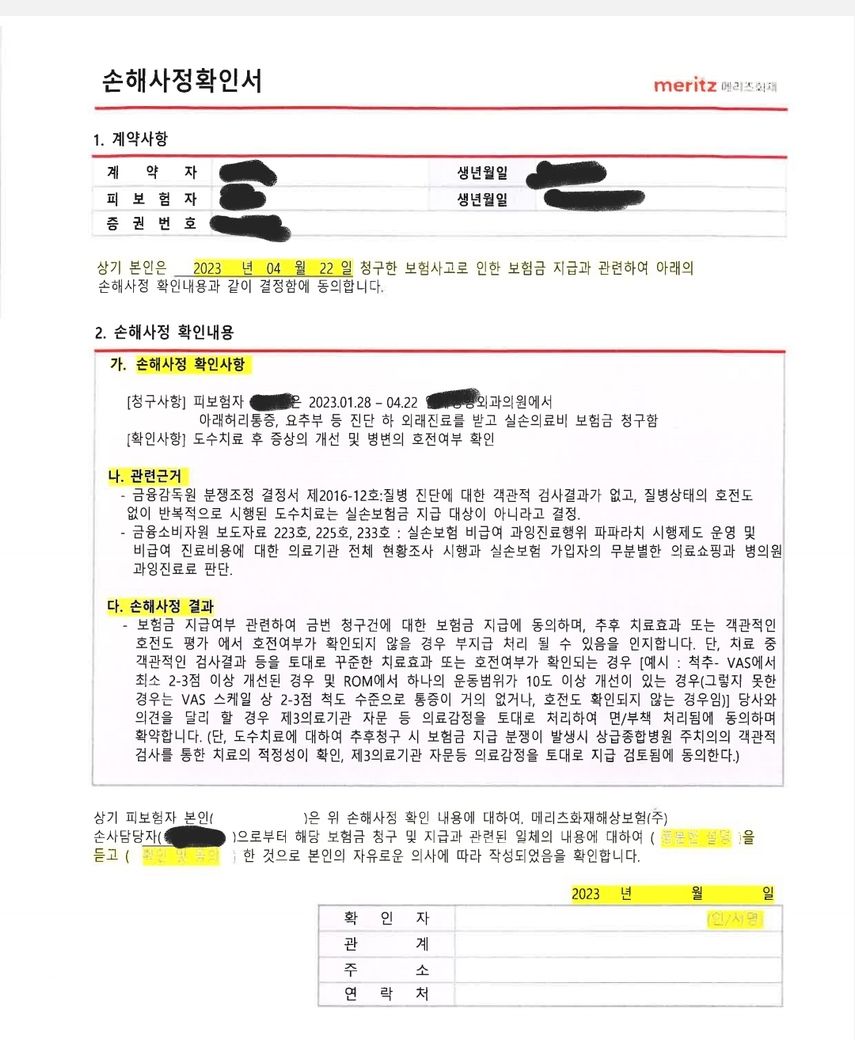 혹시 이 손해사정확인서에 싸인을하면 나중에 도수치료를 진행하는데 문제가 있을까요?