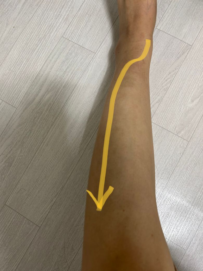 발목 안쪽 복사뼈에서 시작되어 바깥쪽으로 가서 정강이로 가는??? 그게 문제인 것 같다고 하시네요.