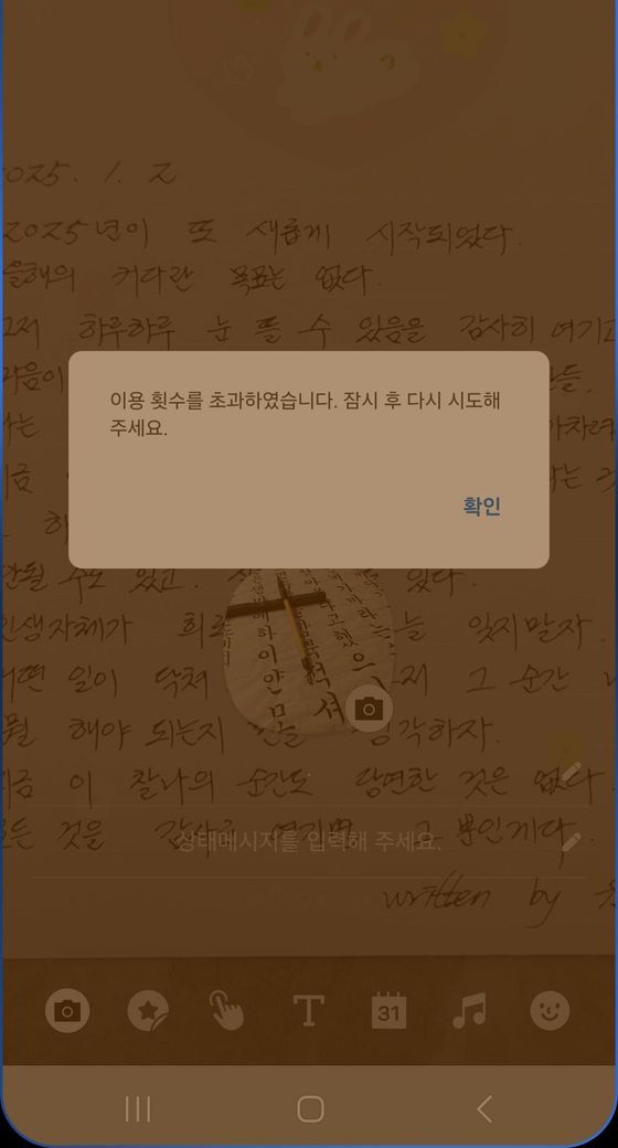 지웠다가 다시 올리느라고카톡 프로필 사진 꽤 여러장을 한꺼번에 올리는데^이용 횟수를 초과하였습니다.잠시 후 다시 시도해 주세요^ 라고 뜹니다ㅡㅡ오류 메시지 이런건 처음 보네요ㅜ어느 정도 있어야 올릴 수 있게 되는거죠?