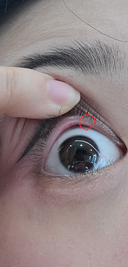 제공하신 사진에 표시된 눈의 상태는 피막이나 결막 낭종, 또는 표면에 생긴 다른 종류의 변화일 수 있습니다. 이러한 변화는 대개 불편감이나 시력 저하 없이 발견되는 경우가 많습니다. 하지만, 눈은 매우 민감한 기관이므로 아무런 증상이 없더라도 전문가의 평가를 받는 것이 좋습니다.
