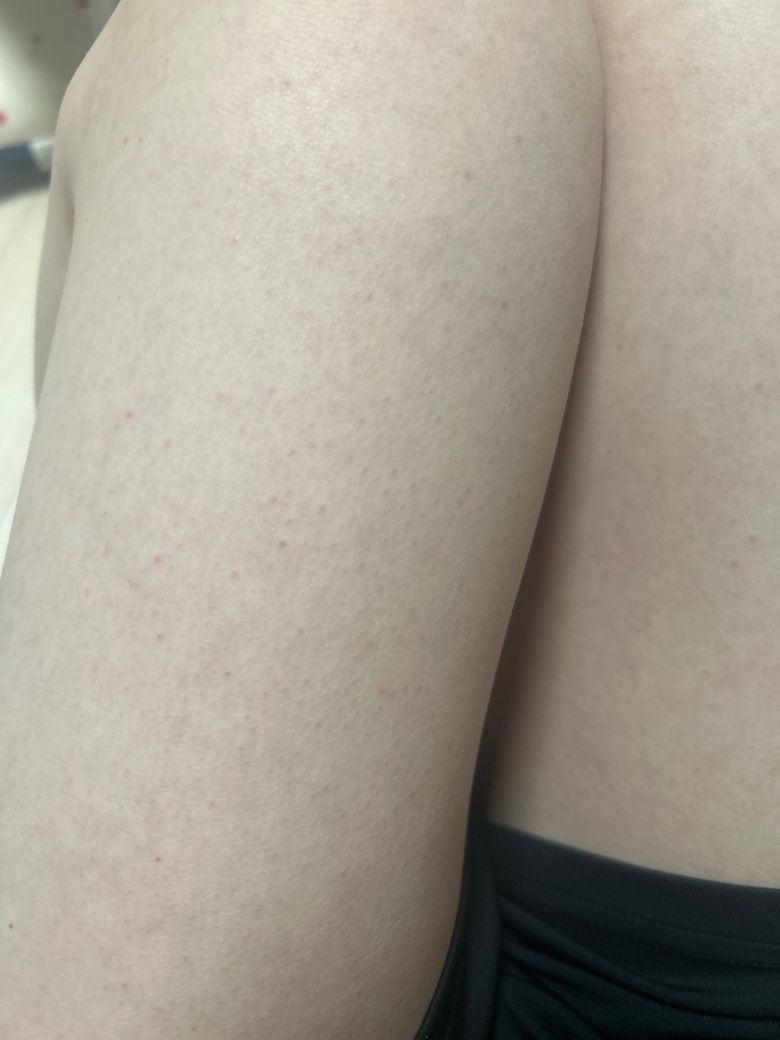 사진 소견만으로 정확한 판단을 내리기는 어려습니다만 모공각화증을 의심해 볼 수 있어 보이는 소견입니다. 다만 정확한 감별 진단 및 상태에 맞는 치료 판단을 위해서는 피부과적으로 한번 진료 및 검진을 받아보시길 권고드립니다.