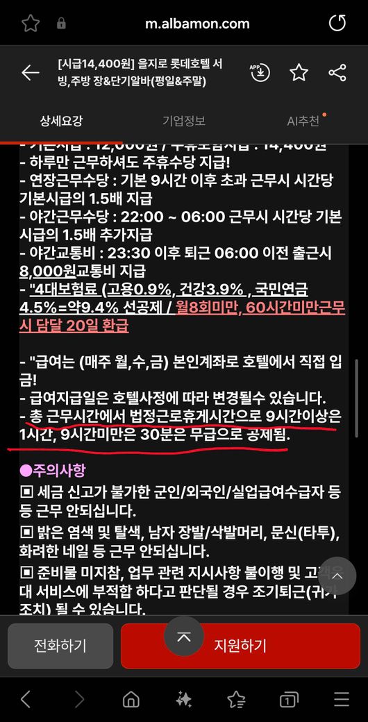 다만, 질문자님께서 보여주신 공고문을 정확하게 파악할 수는 없으나, 총 근무시간이라는 용어가 휴게시간 1간, 근무시간 8시간 이렇게 합하여 총 근무시간 9시간이라 표현하는 것이라면 위법하지 않습니다.