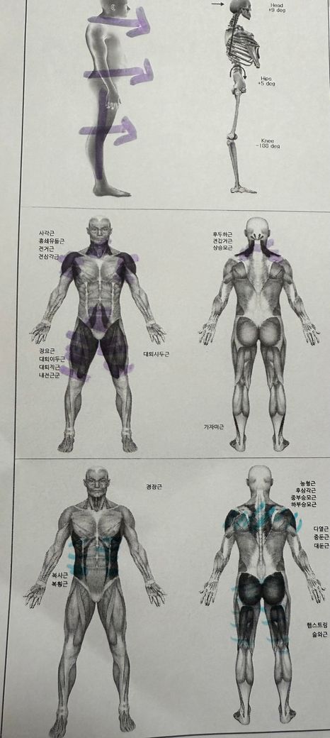 3. 전면의 장요근,대퇴이두근,대퇴직근,내전근군의 단축이 되어있는 상태인데 요걸 이완시켜 주고 복사근, 복횡근, 다열근,중둔근,대둔근을 강화 시키려면 어떤 스트레칭이나 운동을 하면 좋을까요?