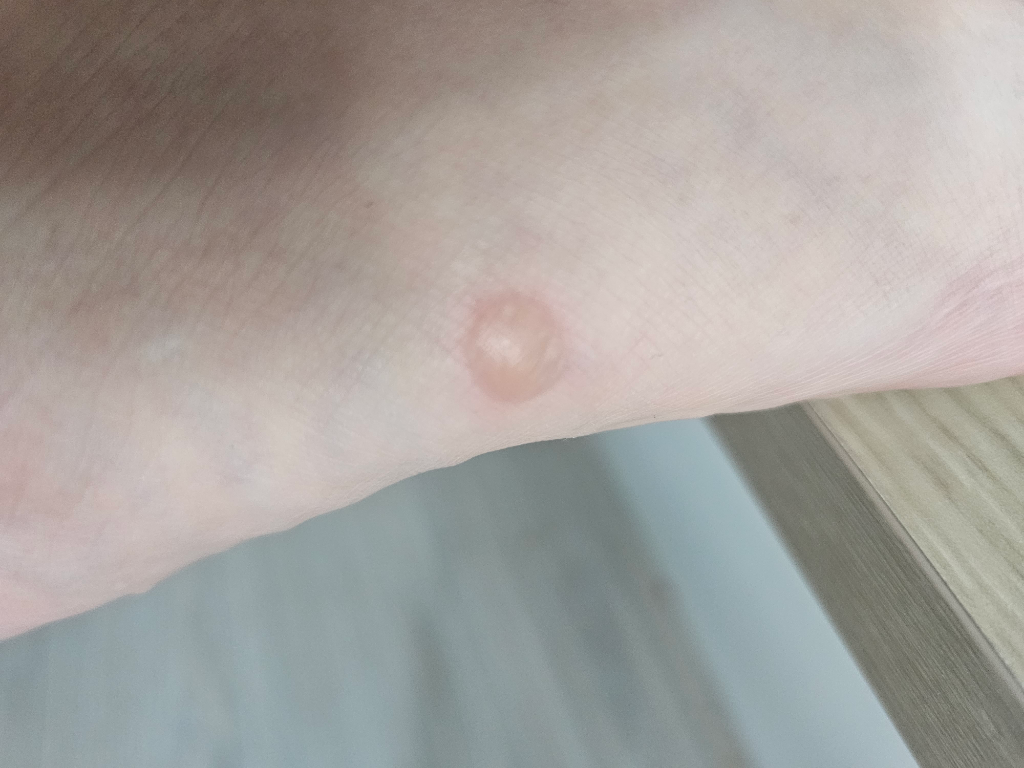 물집으로 보입니다. 우선 일부러 터트리거나 자극하지말고 경과를 보시면 자연적으로 회복이 되실 것입니다. 병변이 잘 호전되지 않거나 악화경과를 보인다면 피부과 진료를 보시기 바랍니다.