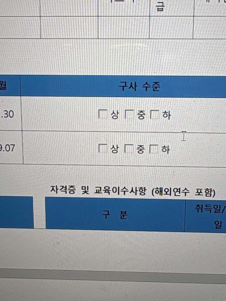 회사 지원서가 워드파일로 되어있고 영어 구사 능력 표시 부분에 해당 사진처럼 체크 박스가 있는데 두번째 사진처럼 도형 전체로 선택되고 지우고 새로 만들려 해도 안되네요… 어떻게 바꾸나요