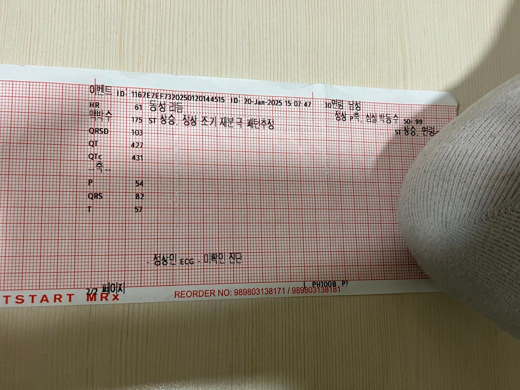 심전도 검사 중 조기재분극이라고 나와있는데 어느 부분에서 몇번 그런건지 정확히 설명을 못 들었습니다 심전도 해석 부탁드립니다. 감사합니다
