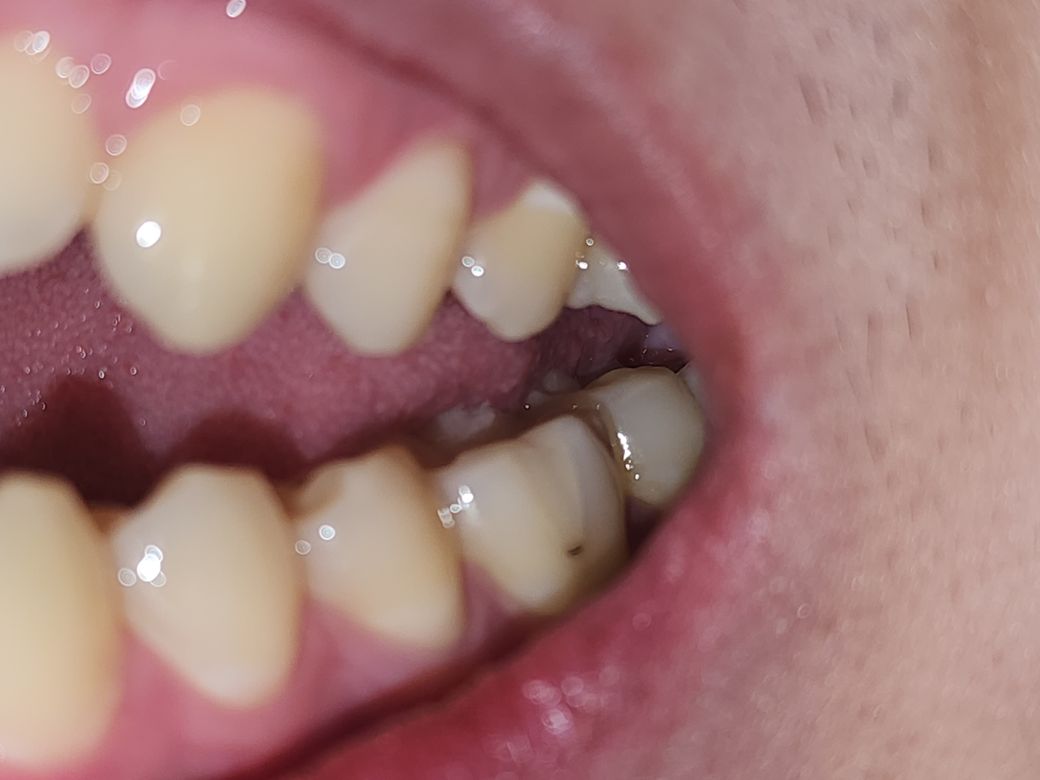 예전에 치료를 하신부위에 착색도 잇고 2차 충치가 발생한거 같습니다. 치과에 가셔서 검진을 받아보시는게 좋을것같습니다.