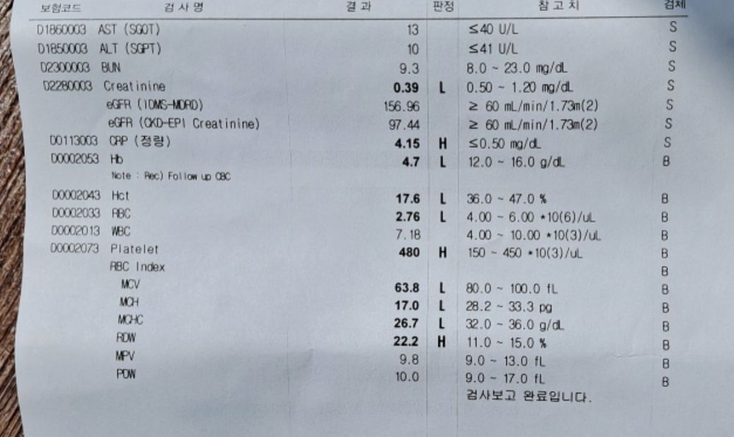 현재 Hb수치가 4.7 정도로 정상수치보다 매우 낮은 상태입니다. 그리고 염증 수준을 알려주는 CRP가 4.15로 정상 수치보다 매우 높은것을 확인할 수 있습니다.